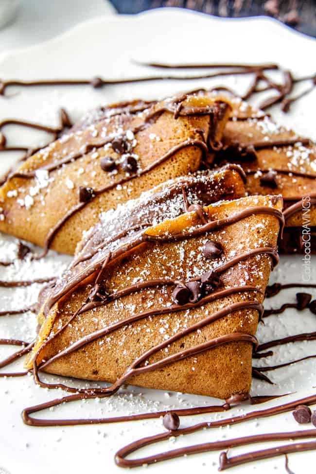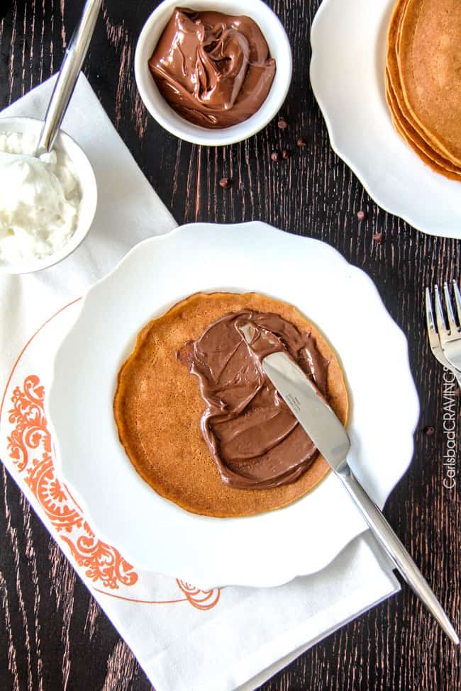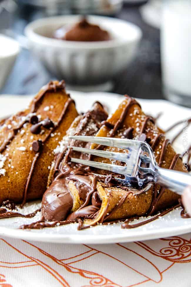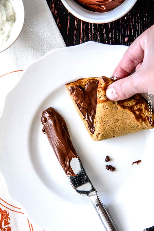 But these arenโt just Nutella Crepes butย Pumpkin Nutella Crepes!ย ย I loooove pumpkin and chocolate together. ย My momโs chocolate chip pumpkin bread is one of my favorite pumpkin recipes to date, so I knew pumpkin crepes would be beyond amazing with Nutella.ย And I was right.ย Since Iโve posted these Nutella Crepes, they have been such I hit, I createdย Pumpkin Bars with Nutella Cream Cheese Frosting โ you donโt want to miss them!