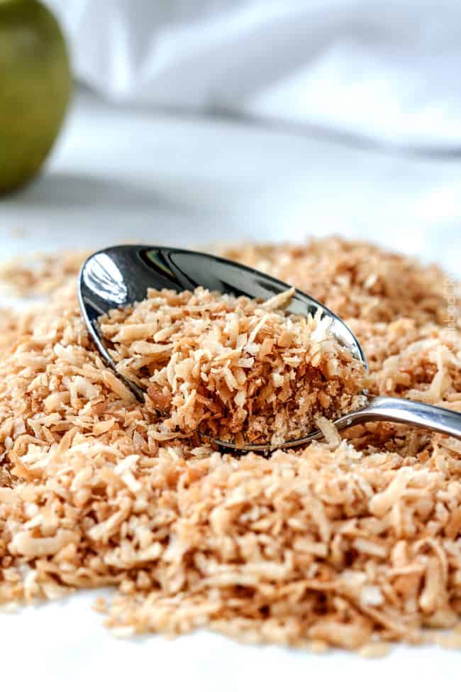 - Preheat oven to 350F degrees. Add coconut to half of baking sheet. Add pecans to other half. Bake for 5-7 minutes, stirring occasionally until coconut is golden, watching closely towards the end so coconut doesn't burn.