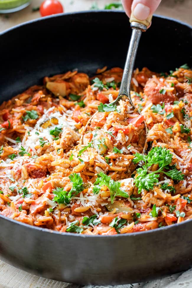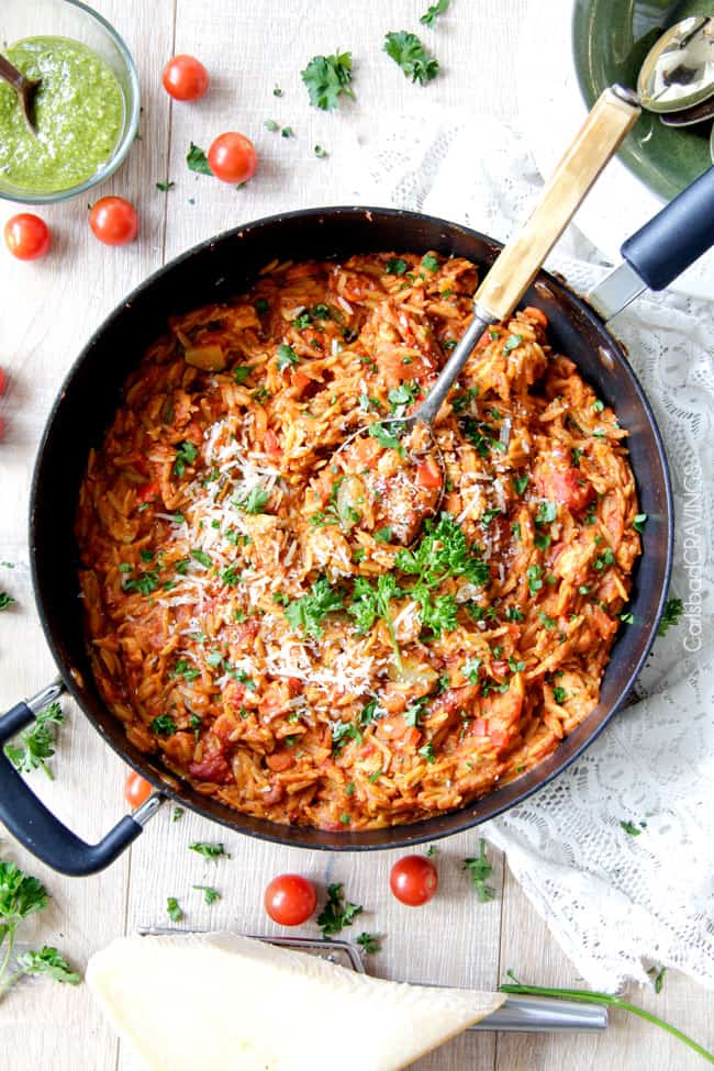 This Chicken Orzo recipe is one of those meals you crave long after your last bite.ย Even though it is an easy one pot meal, it ranks right up there with myย Sun-Dried Tomato Pasta, Italian Meatball Skillet, and Tortellini Al Forno, all of which require a few more steps.