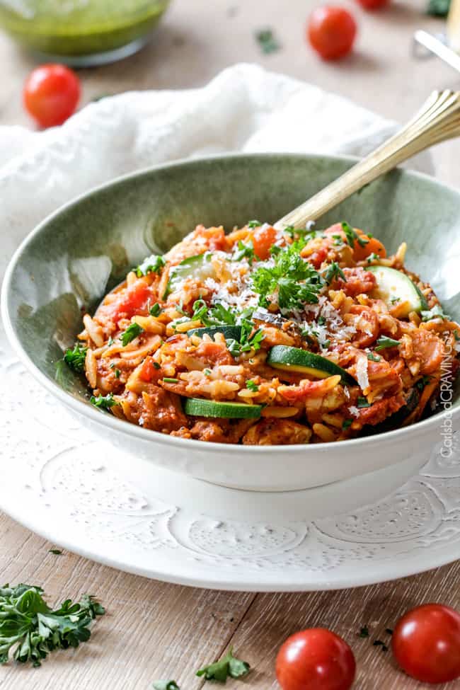 Chicken Orzo bursting with Italian seasonings and vegges bathed in a creamy Parmesan tomato sauce.