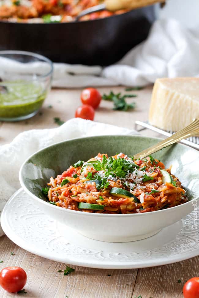 Creamy Parmesan tomato-bathed orzo, juicy chicken, tender crisp vegetablesย and more freshly grated Parmesan. ย Iโm so in love.