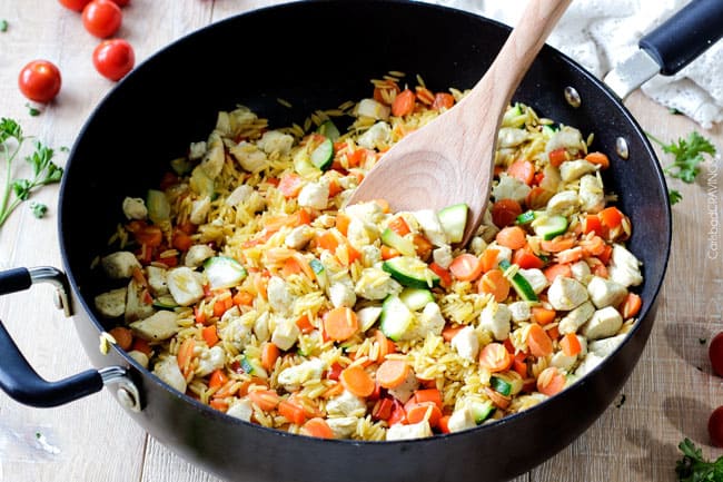 - Bring to a simmer, cover, and reduce heat to medium-low. Simmer for 8-12 minutes, or until vegetables and orzo are tender, stirring every 5 minutes so the orzo doesnโt burn and covering the pot after each stir.