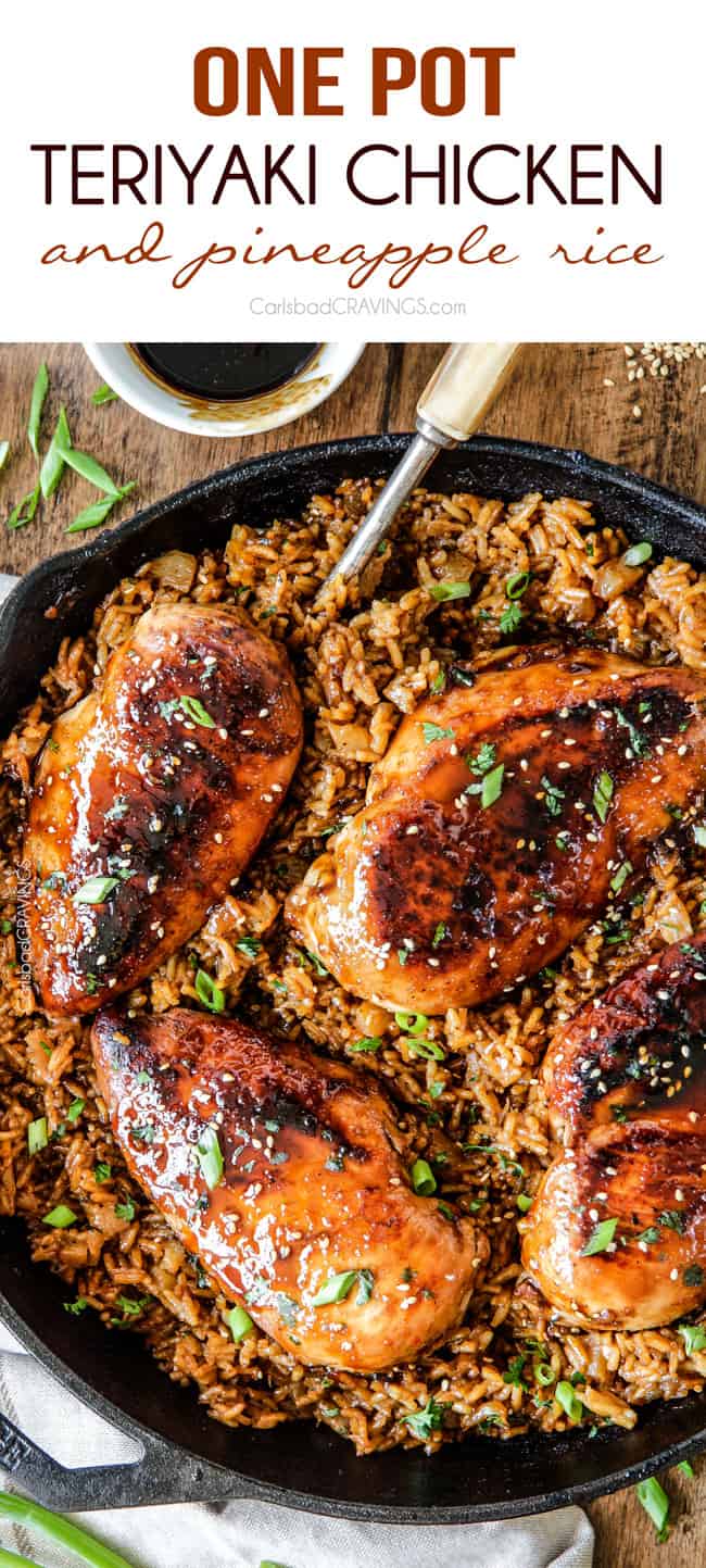 Teriyaki Chicken + pineapple + rice =ย Pineapple Teriyaki Chicken AKA a match made in heaven.ย The marinade doubles as the Glaze (no double work) for incredibly juicy chicken with flavor through and through โ not just on the surface.ย The Teriyaki Glaze seeps into the rice for slightly tangy, sweet, teriyaki pineapple rice that perfectly compliments your chicken.ย It doesnโt get any better.ย