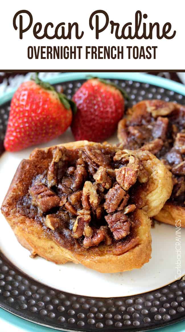 This French Toast Bakeย is right up there with my Overnight Creme Brulee French Toast, and I might even give it an edge, because, as you might have noticed, I love pecans: ย Toffee Pecan Caramel Pound Cake, Maple Dijon Green Beans with Caramelized Pecans, Bacon and Feta, ย Triple Chocolate Turtle Cookies, and on and on and onโฆand I especially love pecan praline. ย Donโt even give me a bite of pecan praline ice cream and expect me to eat just one bowl.