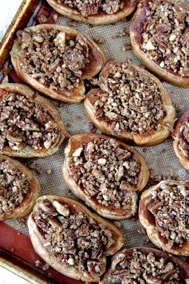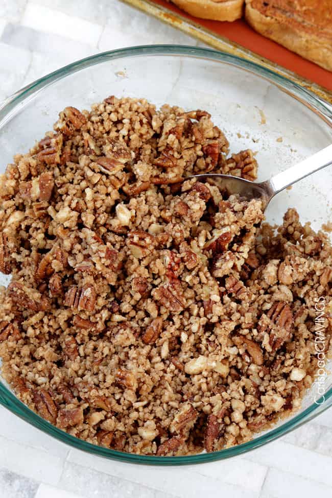 - Prepare Praline Topping while bread is baking the first 30 minutes OR make ahead of time and refrigerate until ready to use: add pecans to a medium bowl and add 2 tablespoons maple syrup and 1 teaspoon vanilla; toss to evenly coat. Add butter, brown sugar, cinnamon and nutmeg to food processor and pulse until it resembles coarse pebbles.* Add brown sugar mixture to pecans and toss to evenly combine.