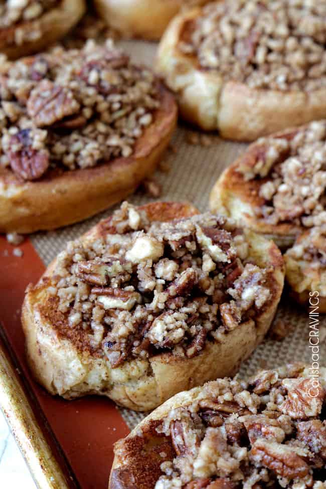 - Bake uncovered at 350F degrees (175 degrees C) for 30 minutes then flip over all the slices of bread. Spoon Praline Topping (directions below) evenly over each slice of bread and bake for an additional 20 minutes.