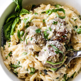 Juicy meatballs, tender orzo, and lightened up luscious sauce โ you are going to want to make this soon. ย Very soon.