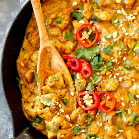 This easy Peanut Butter Chicken recipe is a QUICK one-skillet dinner thatโs huge on flavor, low on effort and belongs in your easy weeknight dinner arsenal.ย Itโs loaded with tender, juicy chicken swimming in the most intoxicating, lusciously creamy, wonderfully fragrant, comforting peanut sauce infused with garlic, ginger, basil, lime juice and coconut milk. ย This Peanut Sauce Chicken also earns major points because itโs made with 100% pantry friendly ingredients โ even the aromatics are powders! ย You can enjoy this Peanut Butter Chicken plain or add in any desired veggies you have on hand.ย Serve Peanut Butter Chicken over rice, cauliflower rice, zoodles, sweet potatoes, etc. loaded with contrasting mangos or pineapple and let your eyes roll back with each sublimely satisfying bite. ย