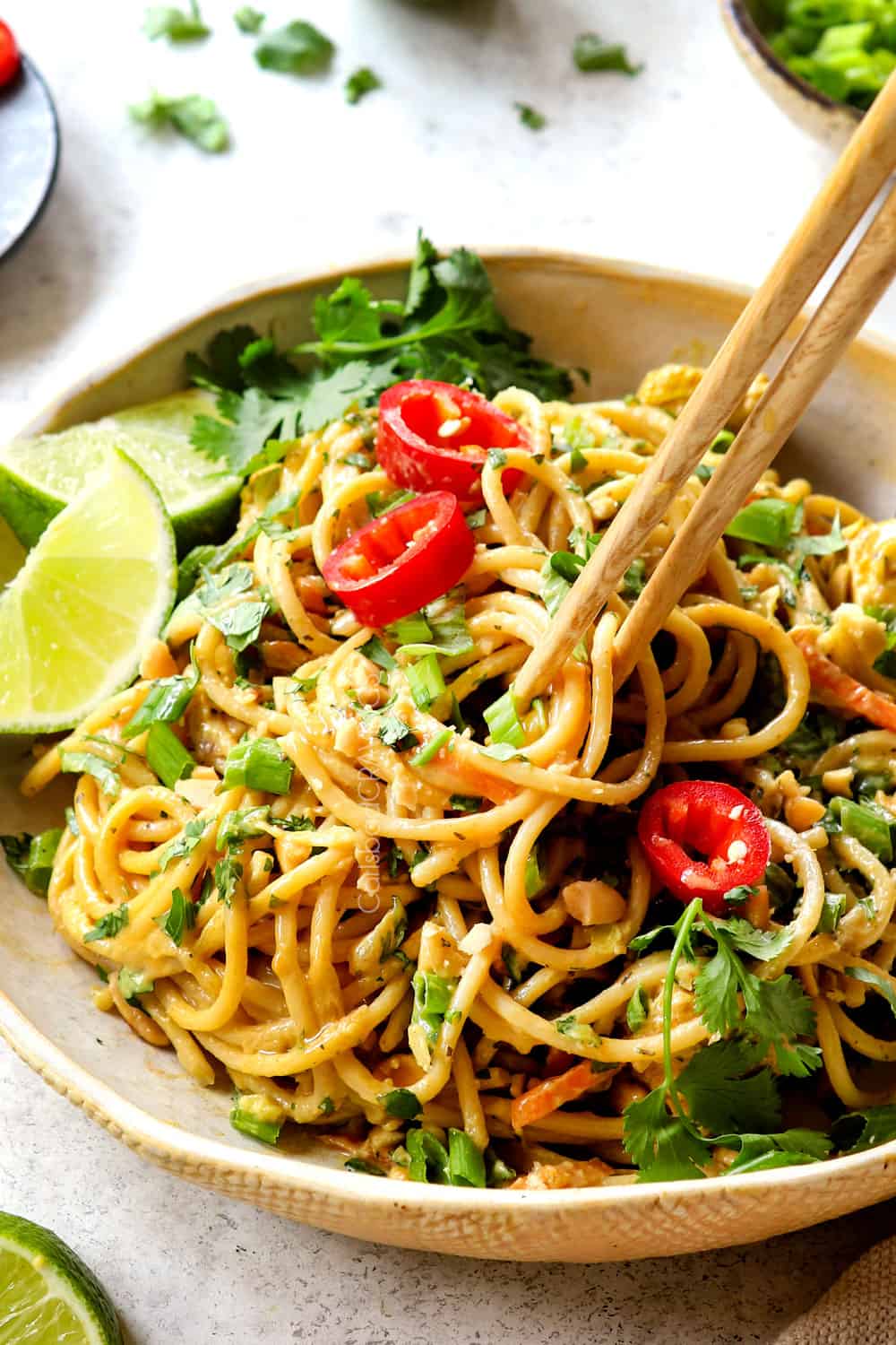 Thai food is my absolute favorite cuisine! I love creating Thai food at home such as Pad Thai, Drunken Noodles, Pad See Ew,ย Red Curry Chicken,ย Panang Curry,ย Green Curry,ย Yellow Curry,ย Tom Kha Gai,ย Chicken Satay and now these Thai Peanut Noodles!
