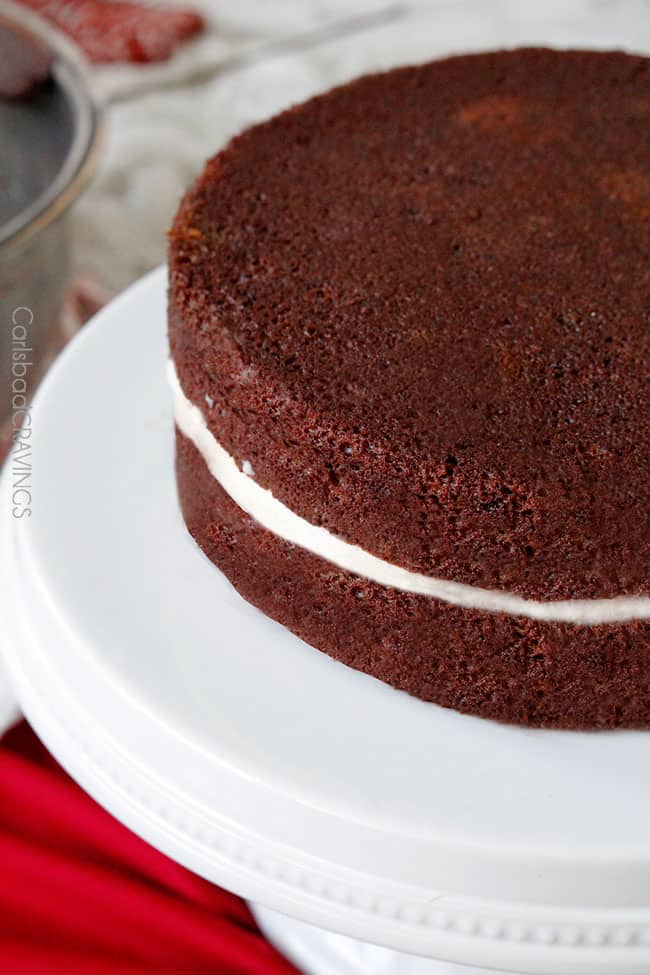 - Peppermint Frosting: Beat butter at medium speed with an electric mixer until creamy, about 1 minute. Add powdered sugar and mix on medium speed for 1-2 minutes. Pour in heavy cream, vanilla and peppermint extract. Mix on high for 3-4 minutes until fluffy. If filling is way too thick, add a couple more teaspoons of heavy cream. When cake has cooled, frost the bottom cake layer with the frosting, leaving ยฝ border around the edge and place in the refrigerator to set, about 30 minutes.