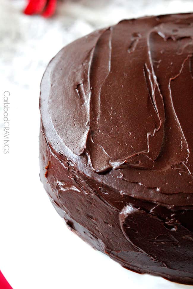 The Chocolate Peppermint Cake is then coated in velvety Chocolate Ganache Frosting. ย Heavy cream, butter and melted chocolate thats been whipped into frosting. ย Who can resist chocolate ganache frosting?!