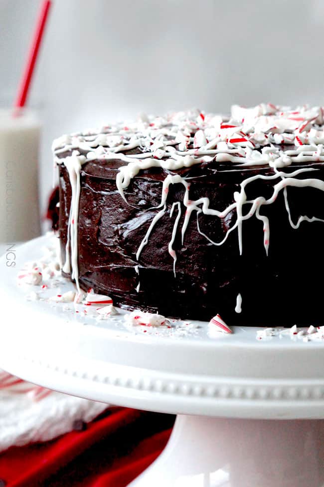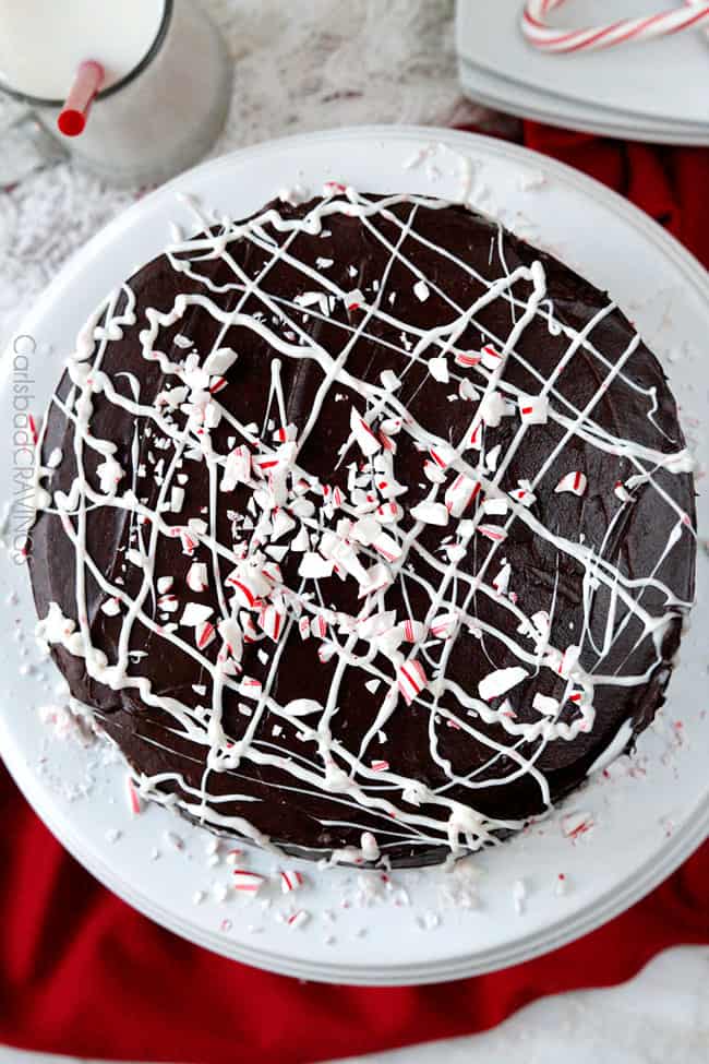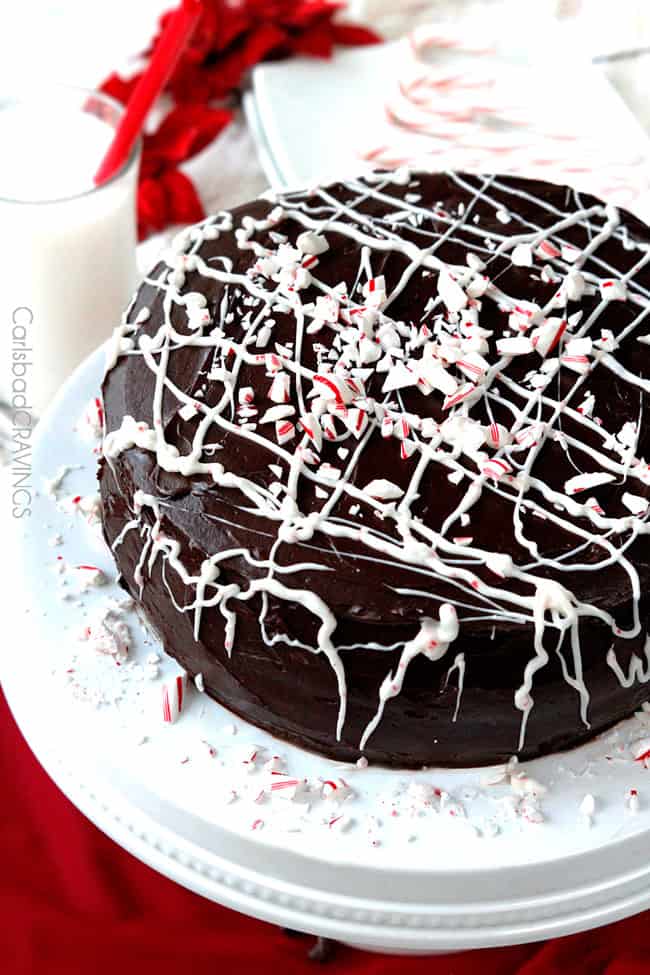 Finally, theย Chocolate Peppermint Cake is drizzledย with melted peppermint candy melts and crushed candy canes because, after all, its Christmas and ribbons of peppermint will fill everyone with the Christmas spirit!
