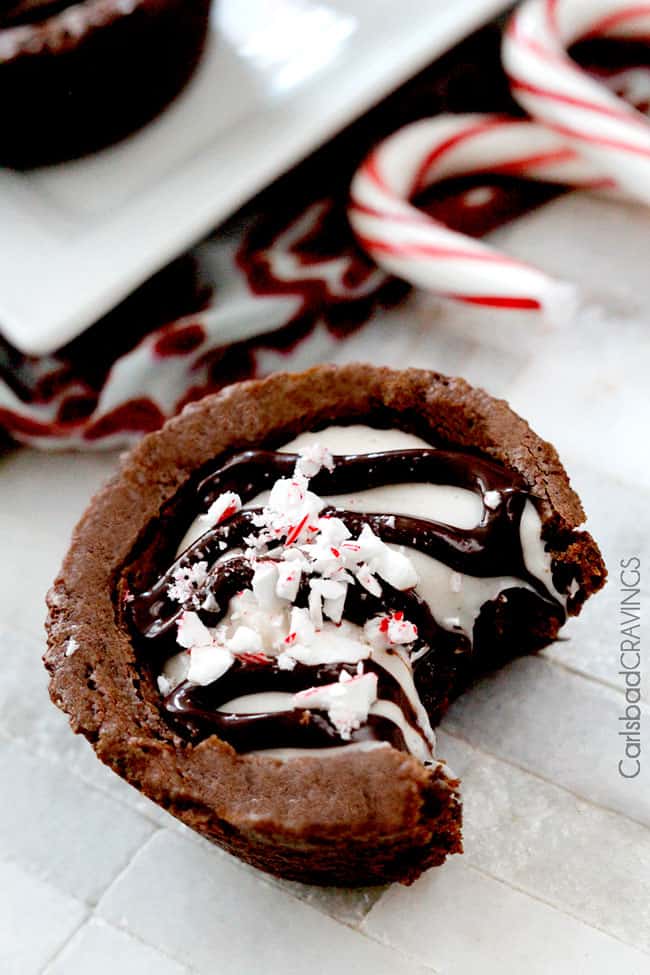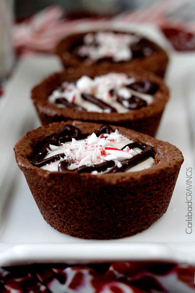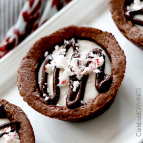 Then drizzle the cups with more melted chocolate and candy canes and Christmas cheer in a cup is born. ย Now if you canโt wait to devour your brownie cups, the eggnog layerย will be gooey and melty and delicious. ย If you wait for the layerย to harden, it tastes like delectable eggnog chocolate bark. ย Bothย amazing. ย Both perfectly compliment the moist, soft peppermint chocolate brownies.
