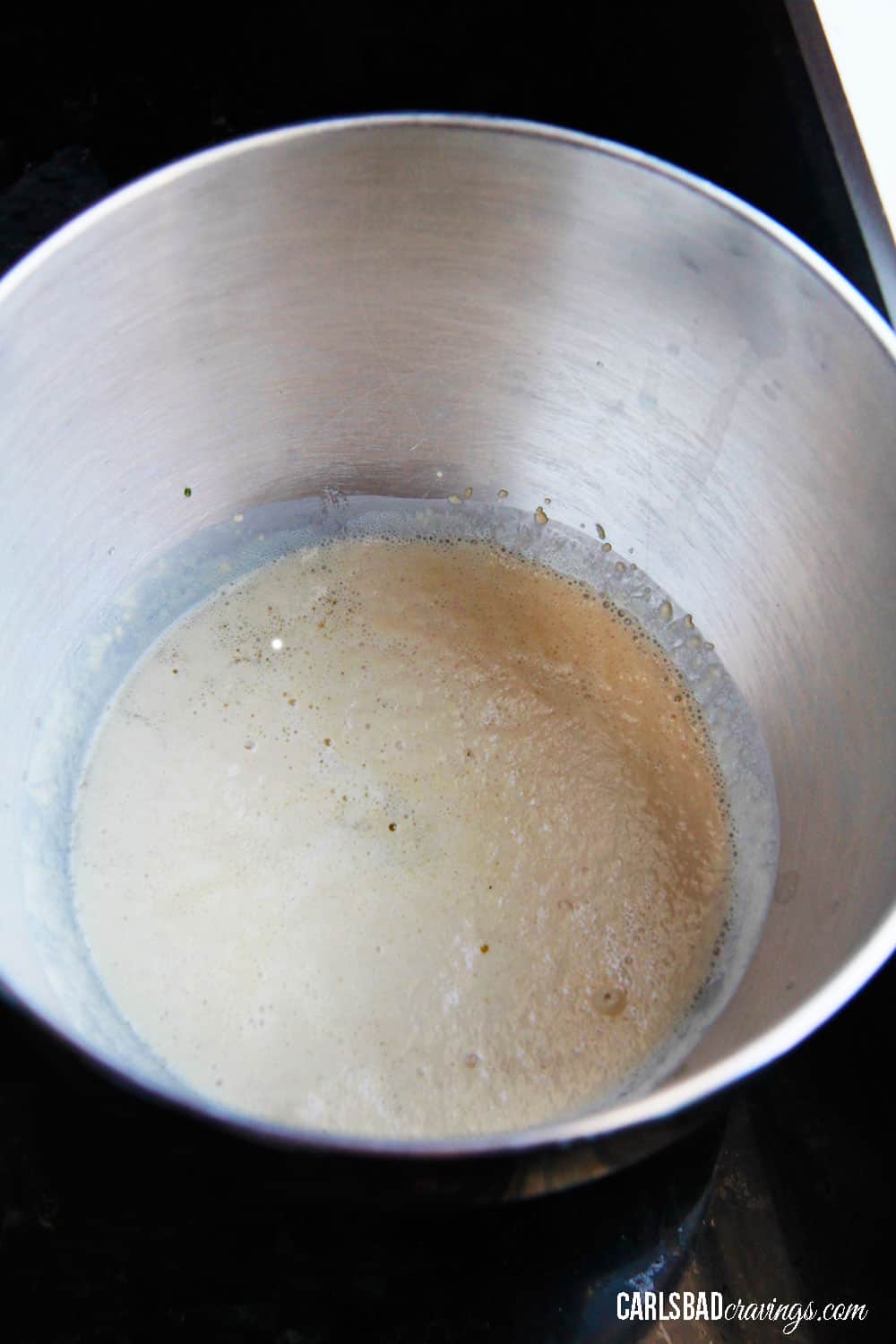 In a large mixing bowl or the bowl of your stand mixer (preferred), stir in the warm water, sugar and yeast. ย Let sit for 5-10 minutes or until the yeast is foamy and dissolved. ย If the yeast doesnโt foam, either your water was too warm, or your yeast is too old.ย Yeast should be no older than 6 months, and water should be around 105 degrees F.ย Repeat until your yeast foams like this (which can take up to 10 minutes):