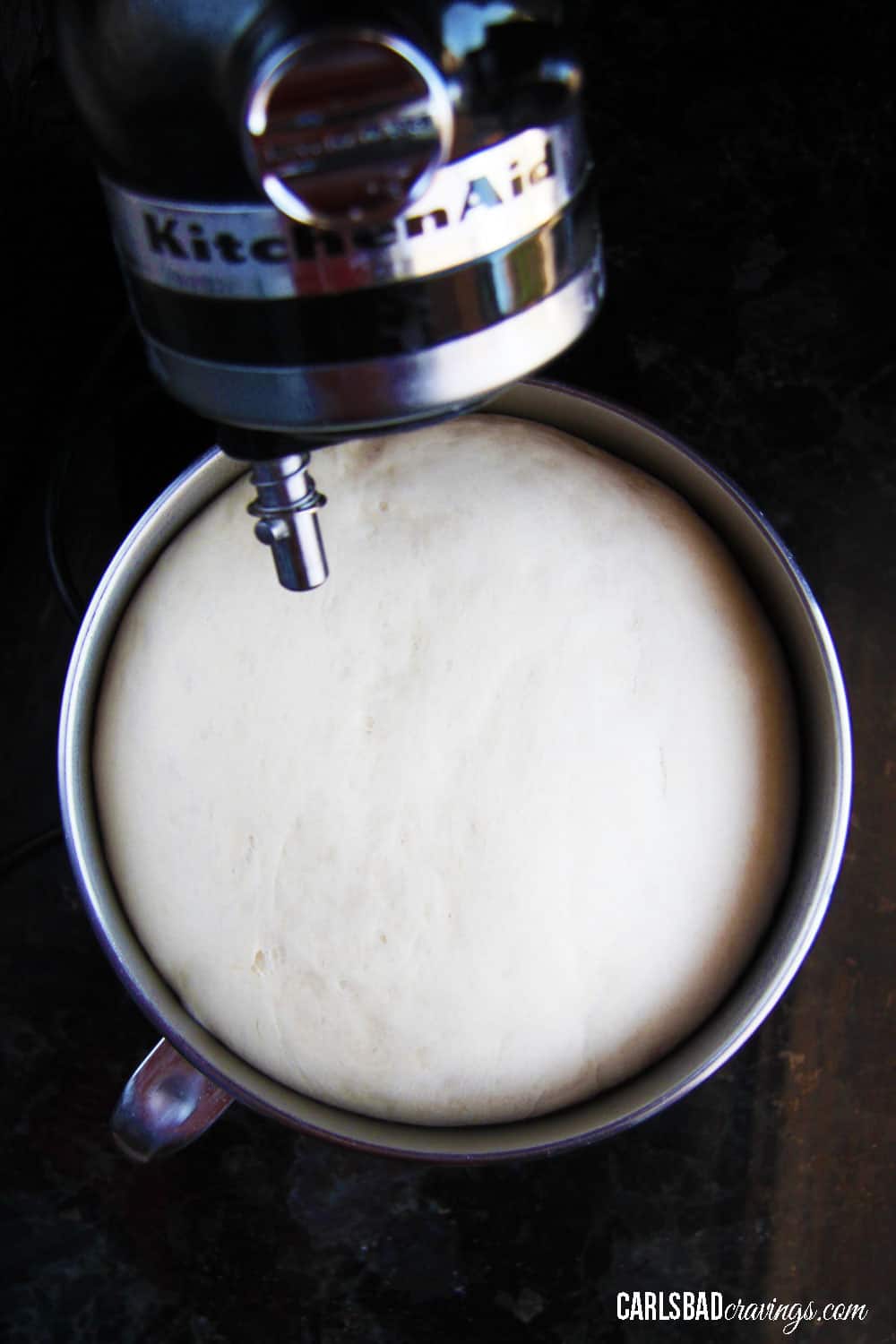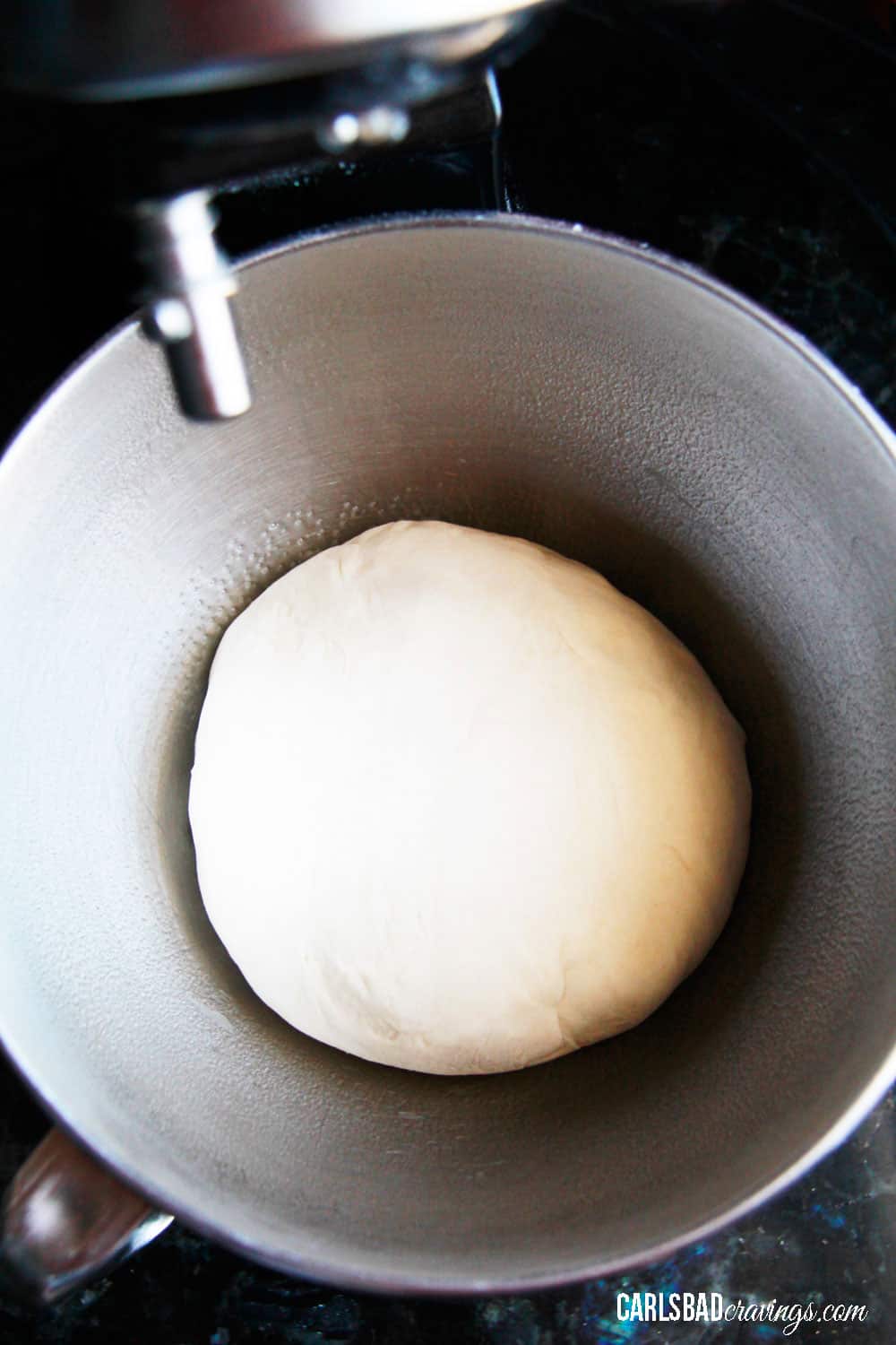Once dough has pulled away from the bowl, continue to mix for 5 more minutes on medium-low speed (or by hand). You may need to place a hand on your mixer so it doesnโt fly off ย your counter!