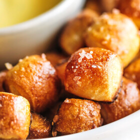 Pretzel Bites make the perfect snack, appetizer, and Game Day food.ย ย They are soft, buttery, chewy, salty and everything a pretzel should be.ย You can customize your homemade Pretzel Bites with different seasonings or just keep them simple and dunk them in my intoxicating Cheesy Jalapeno Ranch Dip.ย Iโve included How to Make Pretzel Bites, How to Reheat Pretzel Bites, How to Freeze Pretzel Bites and More! (updated recipe)