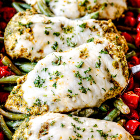 Oh my word. . . This is fabulous! I love anything with pesto, this took the chicken, tomatoes and green beans over the top! This hit my new top favorite meal right next to artichoke chicken. All in one pan to top it off! Thank you so much for this recipe!