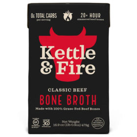 - 1.ย Kettle and Fire: is beefy, savory, with roasted, caramel notes and aromatic veggies. ย It can be found on Amazon, Sprouts (shelf stable/not frozen) or use their store locator.