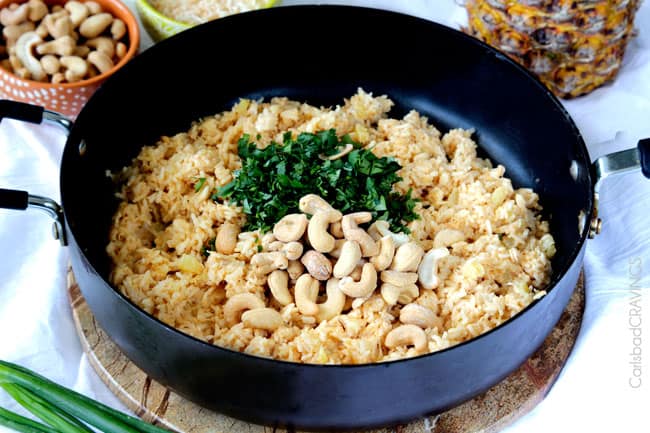 - Just before serving (so the lime doesnโt get lost), stir in the cilantro and lime juice to balance the sweet pineapple. Then, add the roasted, salted cashews to add a depth of nuttycrunch.