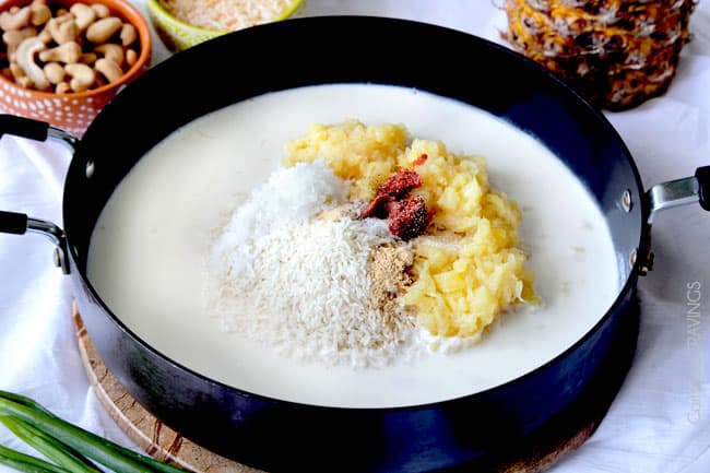 - Add the rice, crushed pineapple, Thai red curry paste, coconut flakes, groundย ginger, garlic, onion, salt, and pepper.