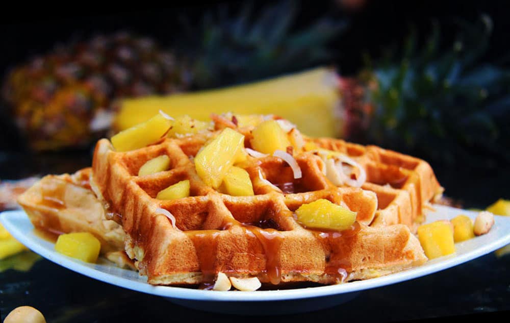 Hawaiian Waffles bursting with fresh pineapple, roasted macadamia nuts and sweet coconut flakes smothered in Pineapple Coconut Syrup!
