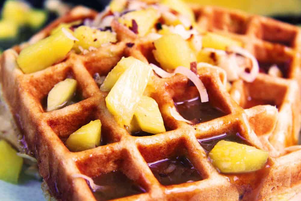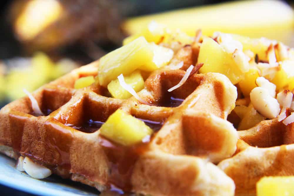 If you like coconut, pineapple and macadamia nuts, then sit back, relax and let every bite of these Hawaiian waffles transport you to paradise.ย Aloha!