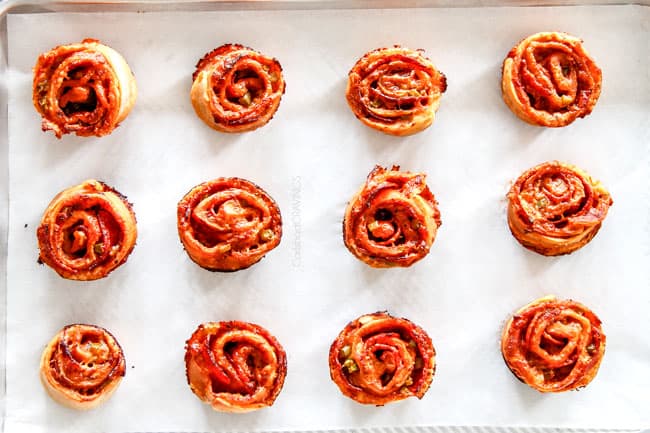 - Place each pinwheel, cut side up, on prepared baking sheet. Bake at 375 degrees F for 25-30 minutes or until dough is golden. Remove from oven and let cool forย 5 minutes before removing pinwheels from pan to a wire rack.ย The Pizza Pinwheels will be a little soft at first but will firm up as they cool.ย Garnish with fresh parsley and serve with remaining warmed pizza sauce if desired.