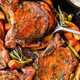 I am first to admit that chicken is my go-to protein, but pork chops are a seriously underrated dinner option. ย They are relatively inexpensive, easy to prepare and can emerge as juicy as a steak dinner when prepared correctly ย โ and these Pork Chops with Apples are prepared correctly.