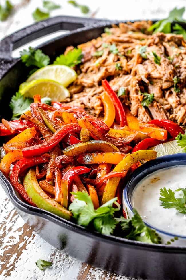 Prep Vegetables ahead:ย While your pork is slow cooking, you can slice all your bell peppers and onions in advance so all thatโs left to do is cook for 10 minutes or so.