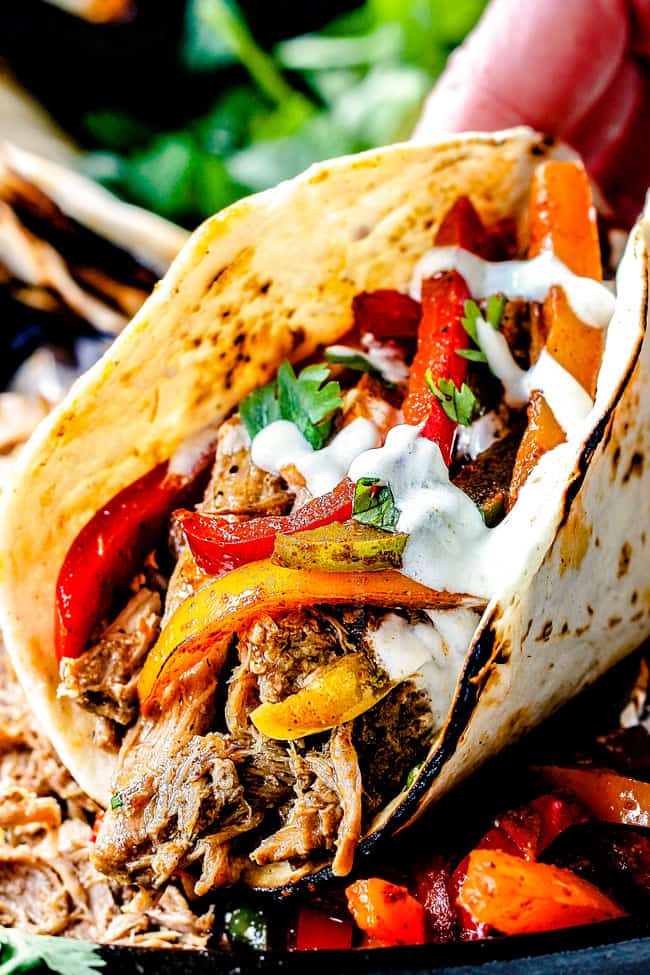 - Assemble fajitas by layering tortillas with cheese (optional), salsa verde pork, bell peppers and desired toppings. Top with Salsa Verde Ranch Crema and hot sauce.