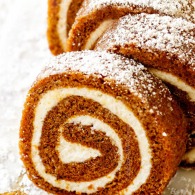 This Pumpkin Roll recipe is one of the best, must-make desserts of Fall and the perfect make ahead dessert for Thanksgiving! A soft, tender, warmly spiced pumpkin cake is slathered in luscious cream cheese frosting OR Nutella cream cheese frosting (both recipes included) then rolled up, chilled and dusted with powdered sugar. The traditional pumpkin roll is an eye-catching crowd pleaser but the Nutella pumpkin roll is beyond delicious! (100% original btw, never been done before โ but now youโll start seeing them everywhere ๐).ย The pumpkin roll is not only pillowy, flavorful perfection but easy to make with pantry ingredients!ย In this recipe post, Iโll teach you how to make a pumpkin roll with step by step instructions, tips and tricks as well as a โhow to makeโ video for the ULTIMATE pumpkin roll every time.