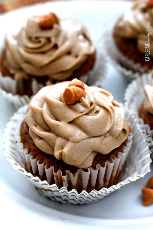These winning Pumpkin Spice Cupcakes with Buttercotch Frosting are pillowy soft and super moist with a hint of pumpkin, cinnamon, cloves and vanilla. ย I could eat the cupcakes plain all day and all night (and that would be why I sent them all with Patrick to take to work โ Iโd like to say Iโm really that nice, but I really just have no self control when it comes to these enticing morsels). ย