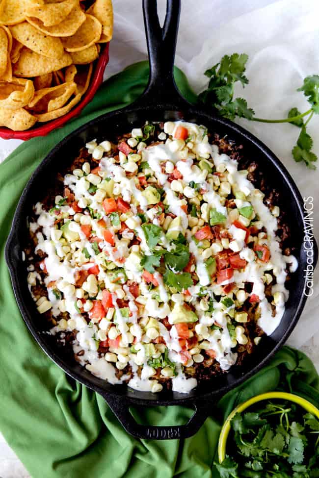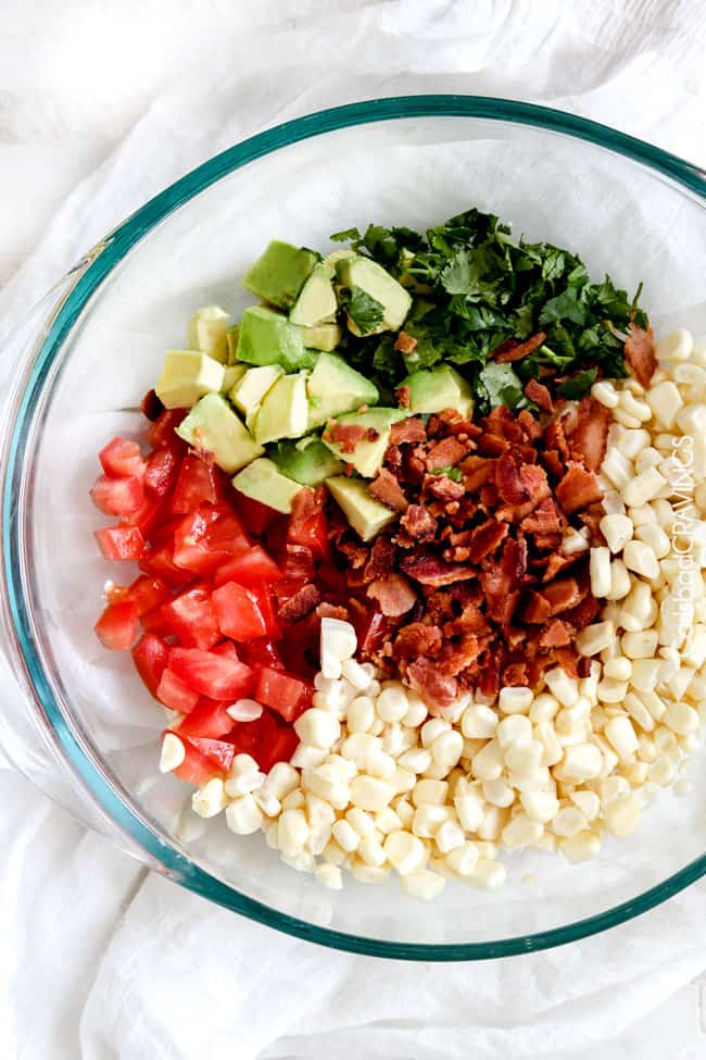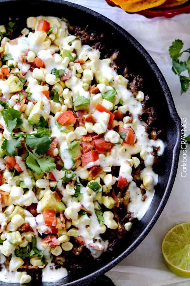 To the fresh corn, add some creamy avocados, tomatoes, cilantro, crunchy bacon (optional but is so good โ its bacon!) ย and a splash of lime. ย Layer this Fresh Corn Avocado Salsa over your hot cheesy, meaty ranch bean dip and instatiable dip is born.