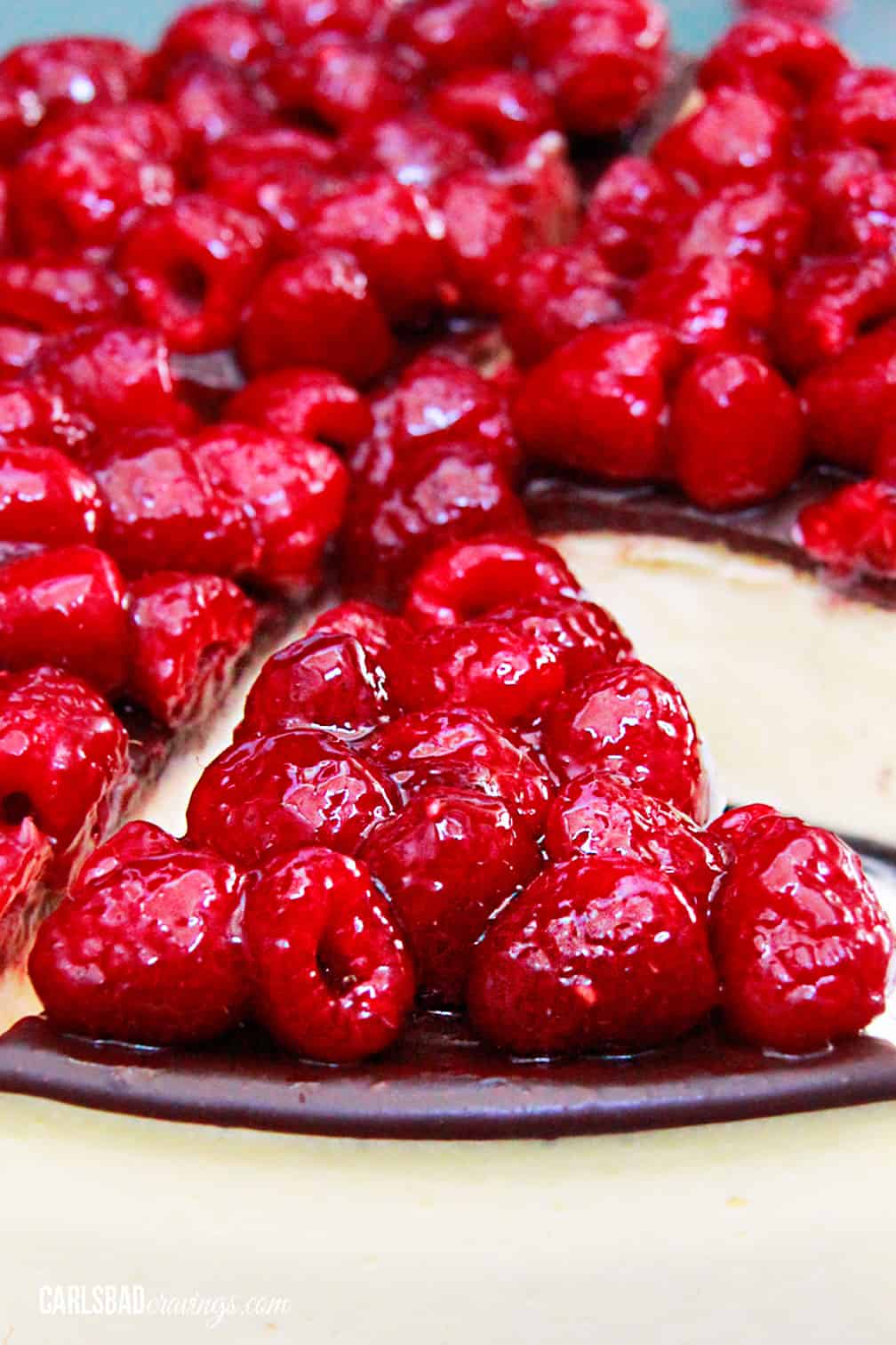 - When ready to serve, top cheesecake evenly with chilled raspberries.