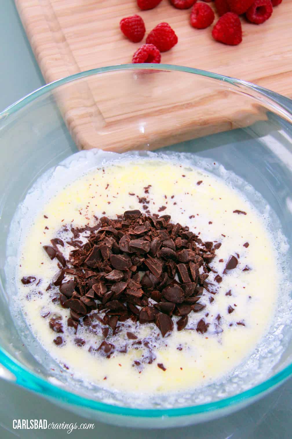 Please donโt let the word ganache scare you โ it is actually SUPER easy to make! Simply add heavy cream and butter to a large microwave safe bowl and heat for 2 minutes, stir to combine. Add chopped chocolate and and stir until chocolate is melted. Let cool for 15 minutes.