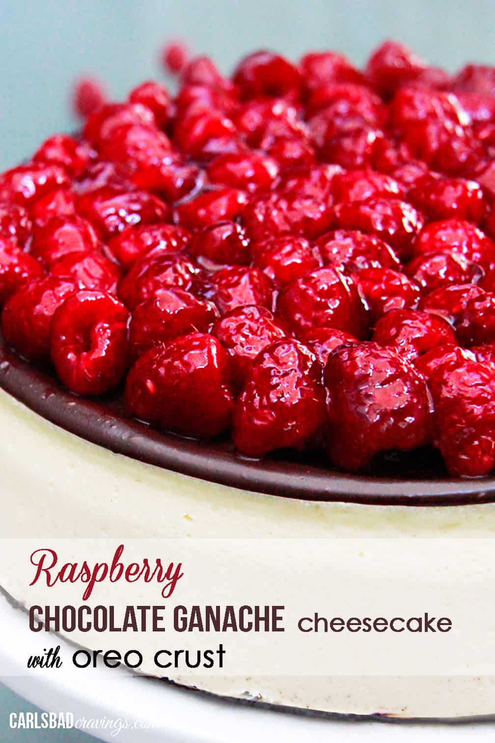 I wanted to create a cheesecake that embodied our favorite raspberry filled chocolates which led to this Chocolate Raspberry Cheesecake recipe crusted in buttery oreos, topped with sweet, super creamy cheesecake (seriously, the texture just kills me โ itโs melt in your mouth, savor on your tongue cheesecake!), covered with a thick bittersweet/semisweet chocolate ganache sure to satisfy every chocolate lover! (and donโt let the word ganache scare you โ its as simple as melting cream and butter in the microwave and adding some chocolate!)โฆall topped with sweet raspberries chilled with raspberry jellyย for the ULTIMATE Chocolate Raspberry Cheesecake experience.