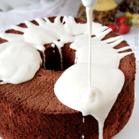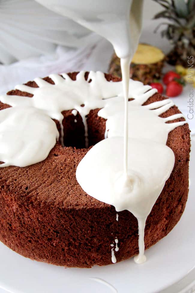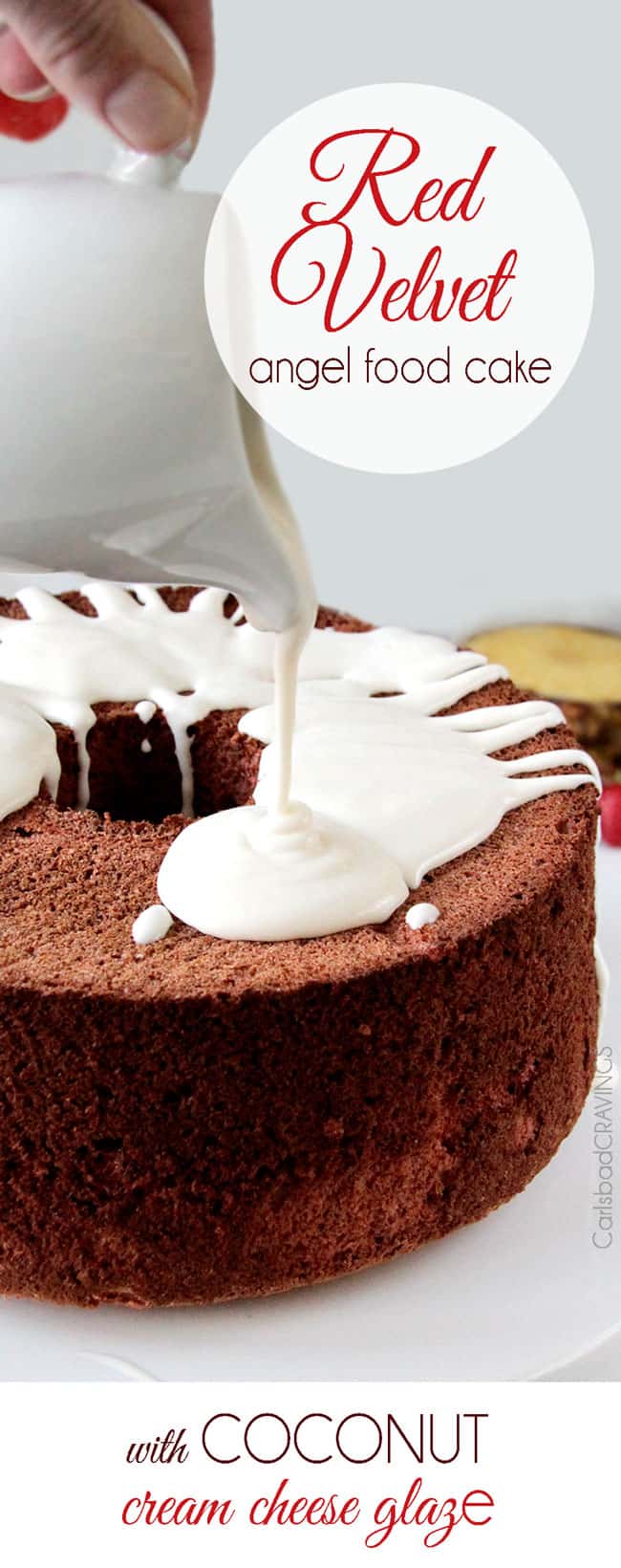 After the cake cools for a few hours, light, airy, divinely delicious Red Velvet Angel Food Cake is waiting for you โ trumpeting you to drizzle it with Coconut Cream Cheese Glaze.