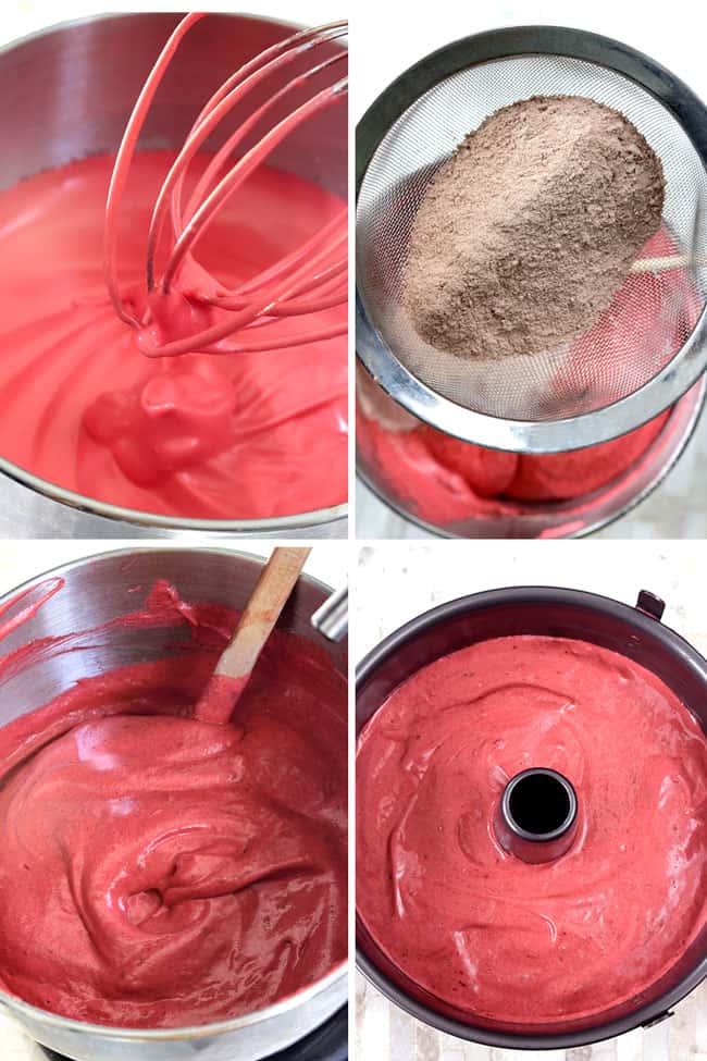 This Red Velvet Angel Food Cake is as easy as these 4 simple illustrated steps: