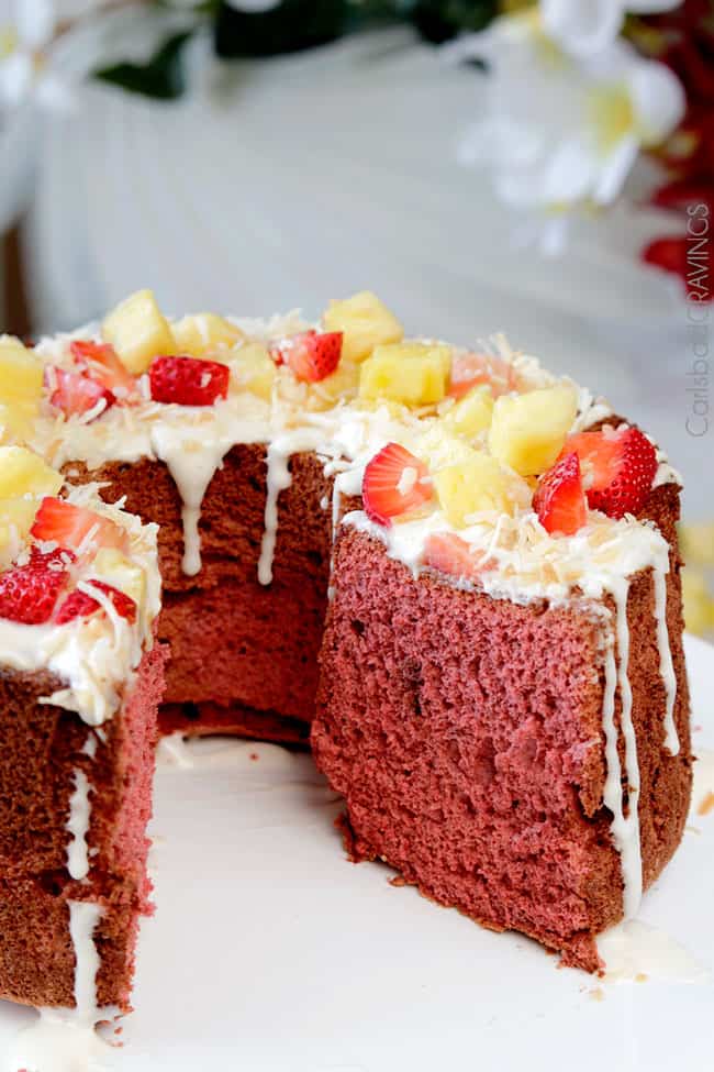 Red Velvet Angel Food Cake with Coconut Cream Cheese Glaze