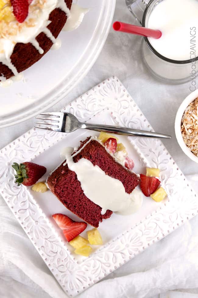 I love this twist on red velvet cake! And, coconut cream cheese glaze? Yum!