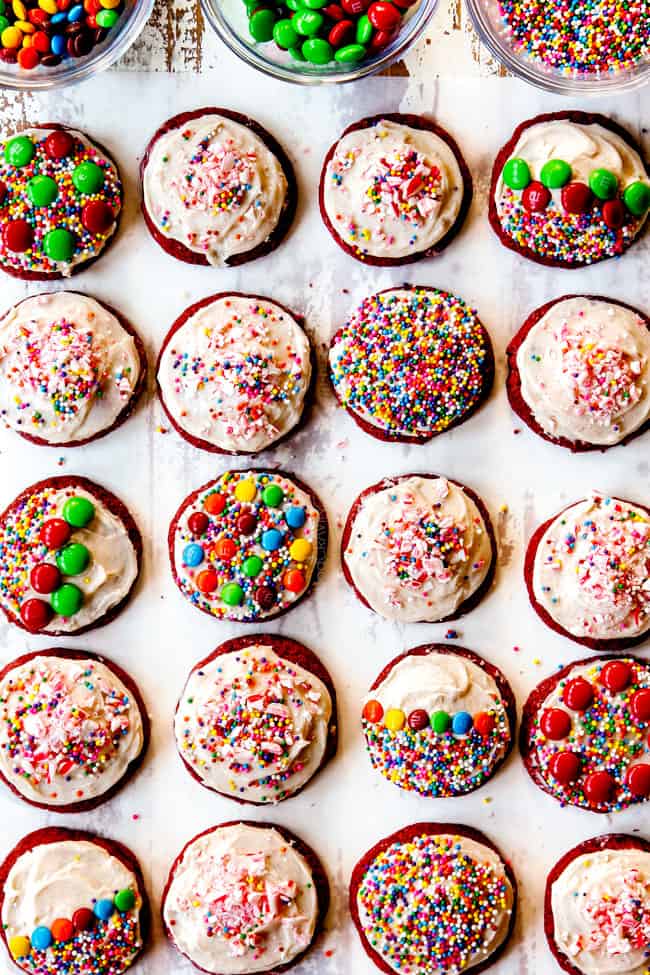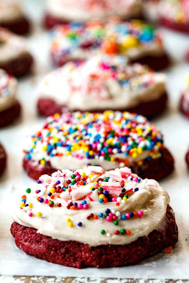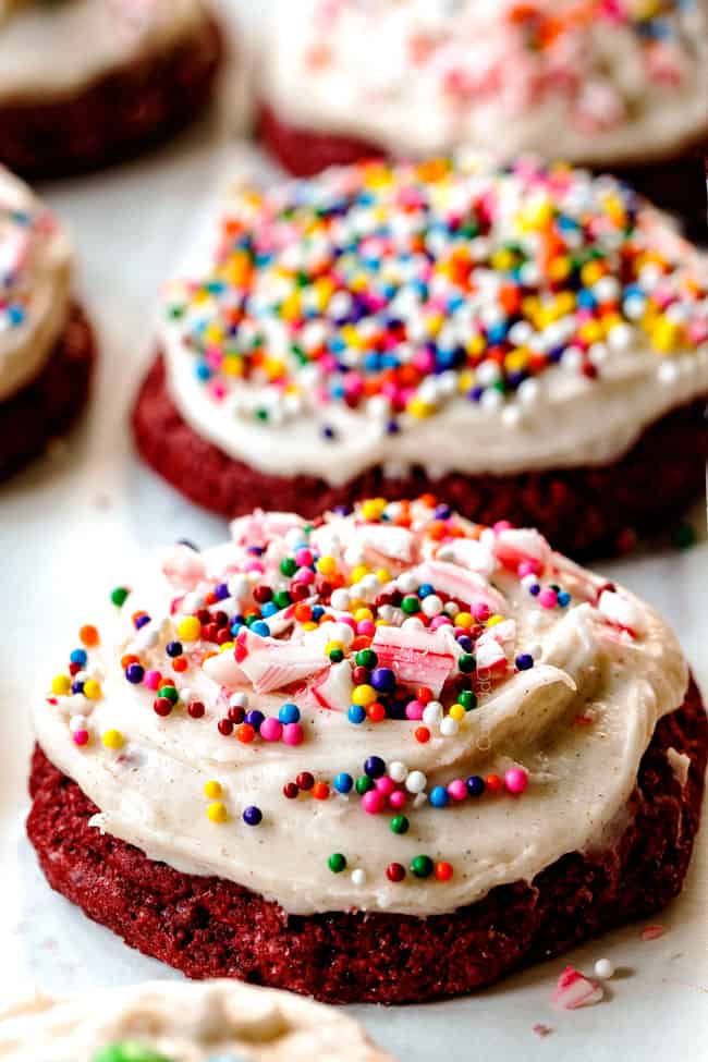 These Red Velvet Cookies are beautiful in their simplicity of contrasting white and red or you can dress them up with crushed candy canes, sprinkles candy or festive designs.ย The possibilities are endless โ and so is the deliciousness!