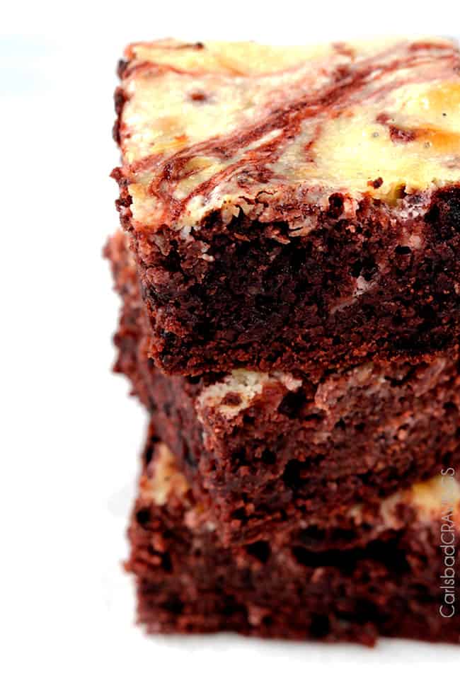 - Don’t over bake: Bake the red velvet cream cheese brownies just until a toothpick inserted in the middle comes out clean. You want these babies to come out nice and fudgy!