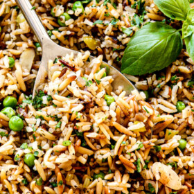 This Rice Pilaf recipe is packed with flavor from the aromatics, toasted rice and orzo, and herb infused broth AND itโs the ideal palate pleasing texture of soft, fluffy rice and al-dente orzo.ย It just doesnโt get any better my friends EXCEPT that the recipe uses pantry friendly ingredients and is SO easy to whip up!