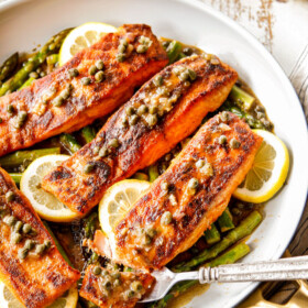 This Salmon and Asparagus recipe is outrageously delicious, gloriously flavorful and deeply satisfying. Best of all, it looks impressive but is SO easy to make all in one skillet for easy prep and cleanup, perfect for all those busy nights!ย The salmon gets dredged in in flour and seasonings, is lightly pan fried until golden, then drenched in an intoxicating lemon, butter caper sauce. The resulting Lemon Butter Salmon truly tastes better than the finest restaurant at a fraction of the price and did I say ready in 25 minutes already? You can cook just the salmon and sauce or swap out the asparagus for whatever veggies you love or have on hand.ย Serve this one pot Salmon and Asparagus plain or over pasta, potatoes or rice or low carb zoodles, cauliflower rice etc.ย for a simple salmon recipe that will have everyone singing your praises and licking their plates.