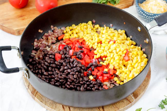 To start, saute your red onions, corn, black beans, red bell peppers and tomatoes for a couple minutes. ย Once tender crisp, removeย so you can use the same pan.