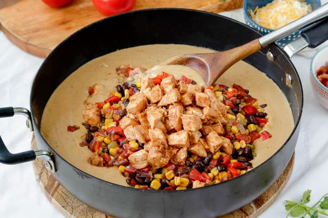 Next, add back your oven baked barbecue chicken and corn, black, beans etc., some barbecue sauce and a little sour creamโฆ.