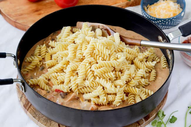 Although this pasta seems like it has a lot of ingredients, most of them are cans you simply crack open or spices you pop the lid of โ so please donโt be intimidated. ย This fiestalicious pasta can all be on your table in 30 minutes because while you pop your chicken slathered in barbecue sauce in the oven and forget about it, you can prepare all the rest.