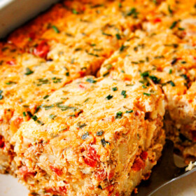 - Tent foil:ย ย tent the foil slightly in the middle but make sure the sides are still covered. The casserole will bake up and you donโt want the cheese sticking to the foil. ย