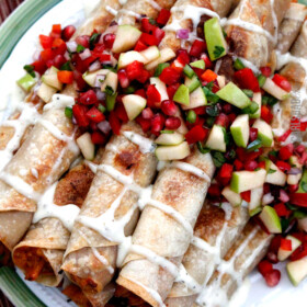 And I particularly love its sweet tang complimented by the salty tang of cheddar cheese rolled in a crispy tortilla and topped with either ranch or barbecue sauce and finally crowned with Pomegranate Apple Salsa. ย The salsa is sweet, tangy, and fresh with the crunch of apples, bell peppers and pomegranate and enlivened by jalapenos, cilantro, honey and lime juice. ย Its crunchy freshness is the perfect compliment to the comforting creamy cheesiness of the taquitos.