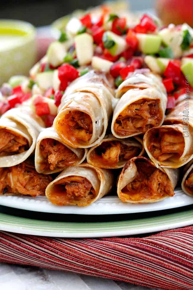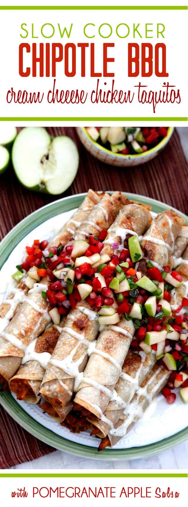Chipotle BBQ Cream Cheese Chicken Taquitos (with Pomegranate Apple Salsa)